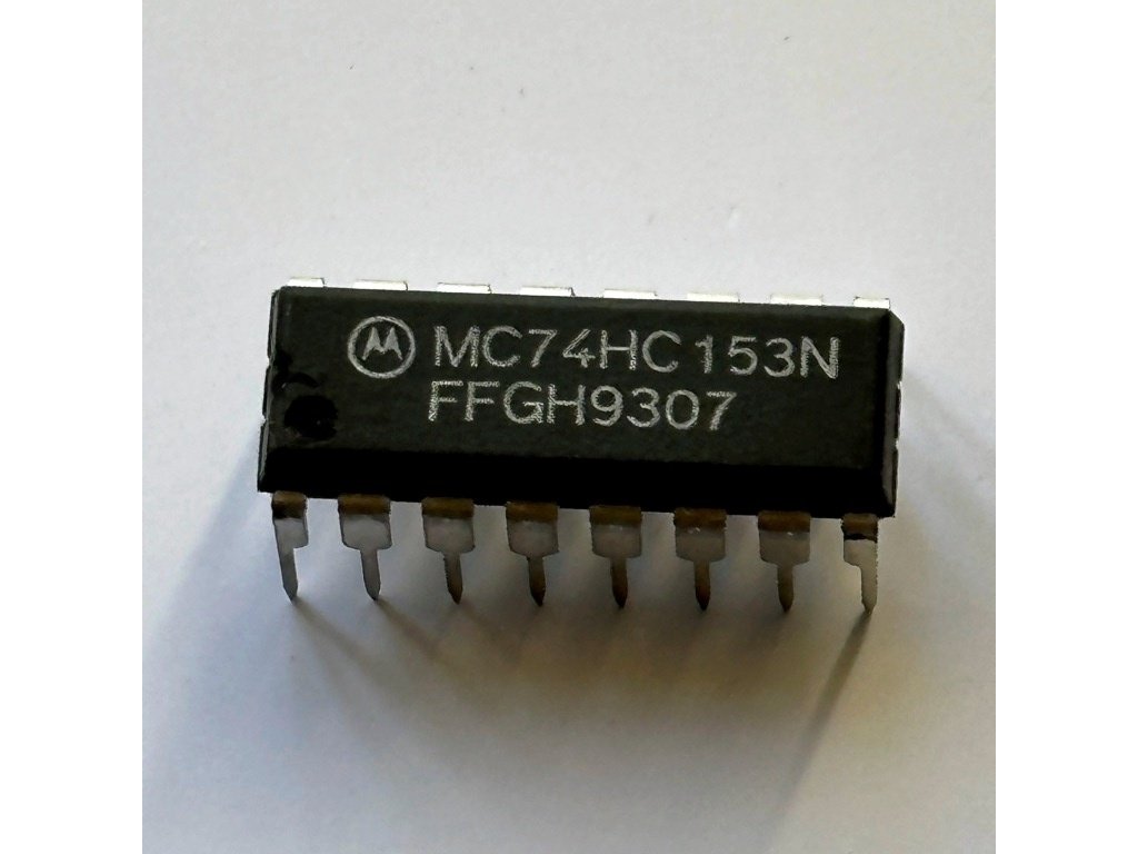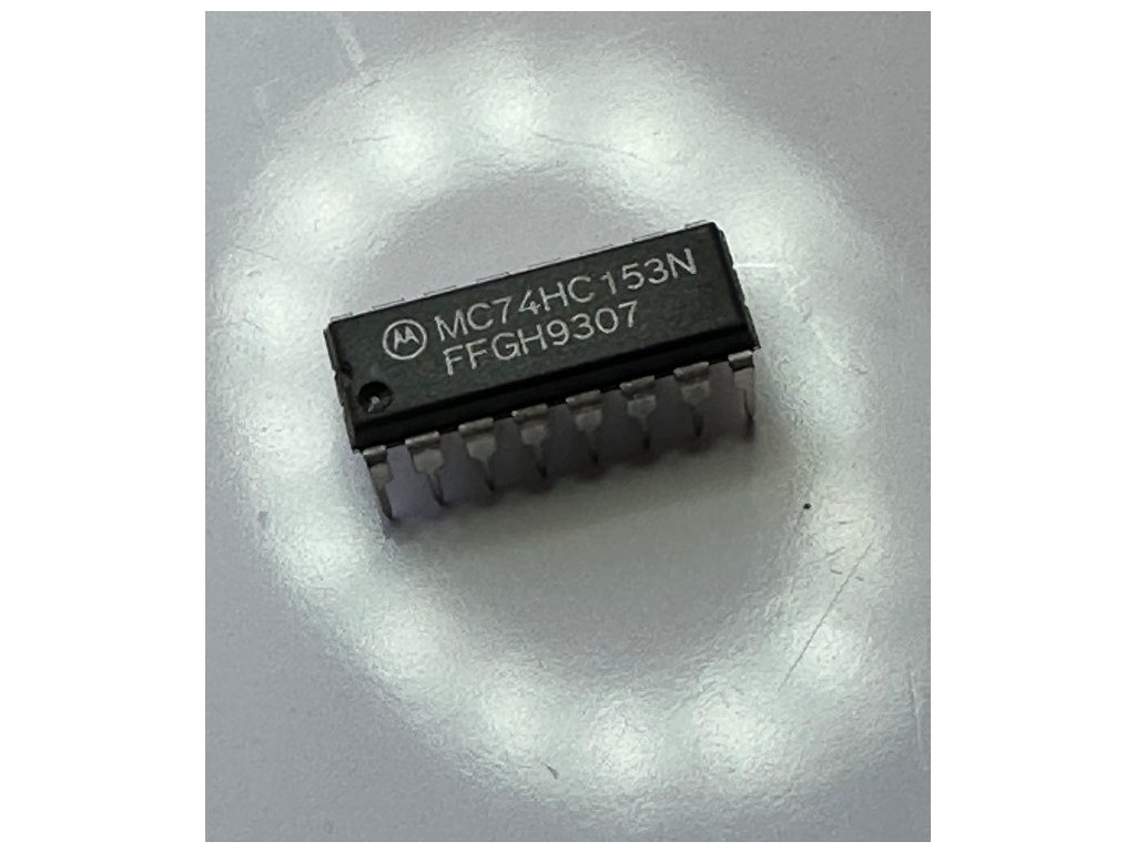Motorola MC74HC153N, DIL16, zwei 1-aus-4-Datenselektoren/Multiplexer mit gemeinsamen Adressen-Eingängen, jedoch getrennten Freigabe-Eingängen.