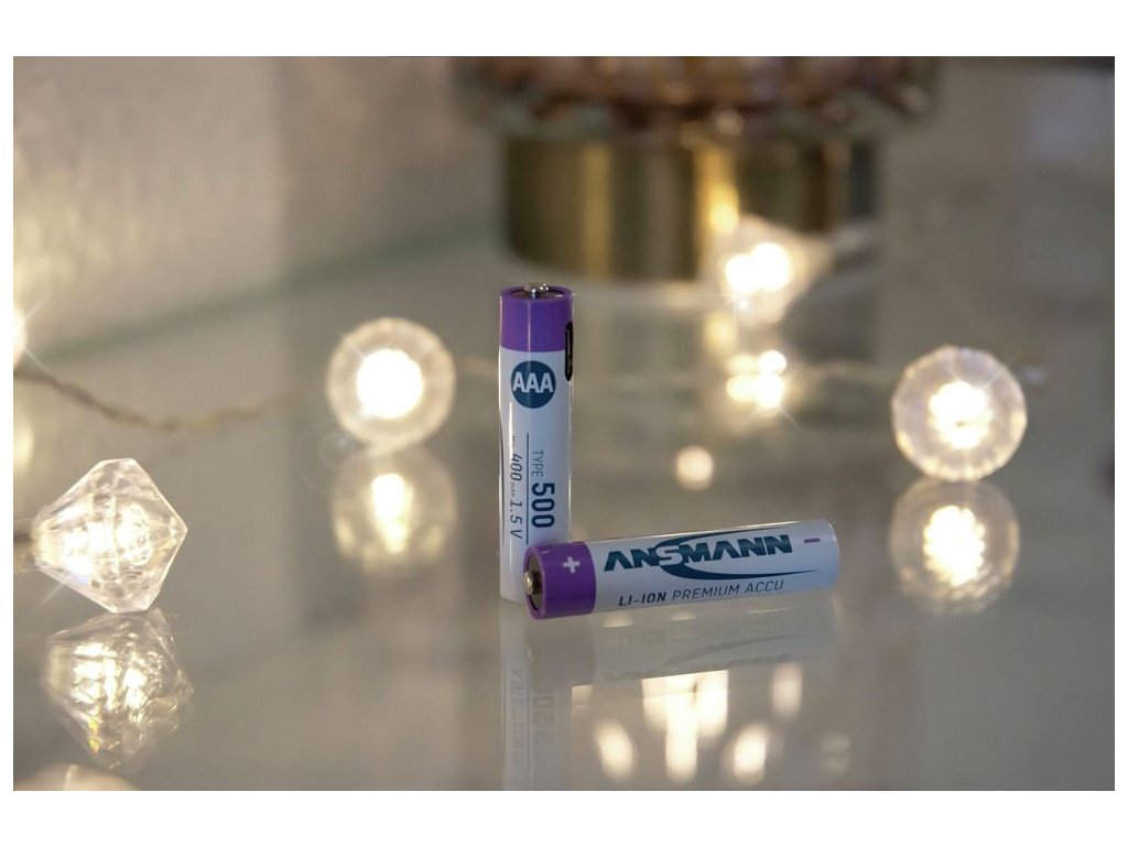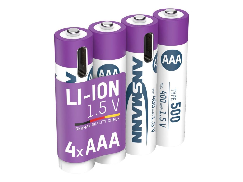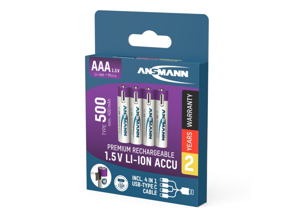 Ansmann Li-Ion Akkus Micro AAA Typ 500 (min. 400 mAh) 4er Papierblister. Micro AAA Lithium-Ionen Akku - 1,5 V / Typ 500 (min. 400 mAh) / 0,74 Wh - Type C Ladung - geschützter Akku aufgrund Sicherheitsbeschaltung.