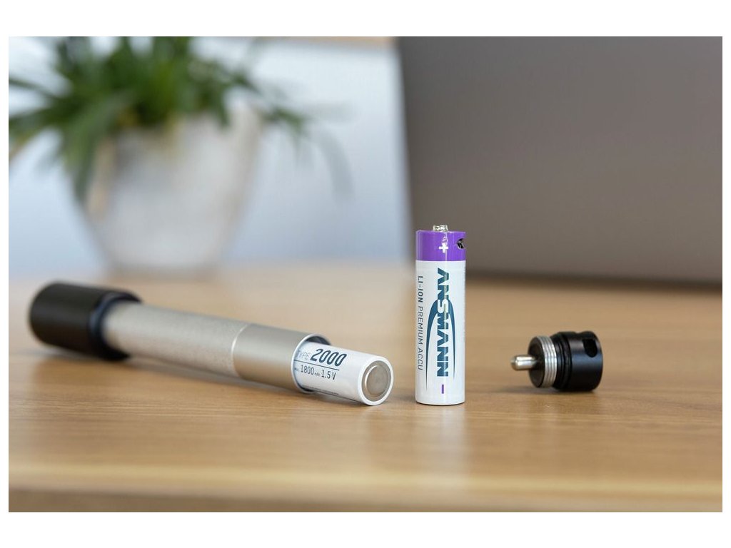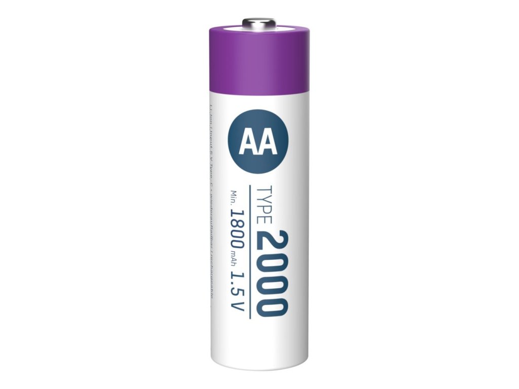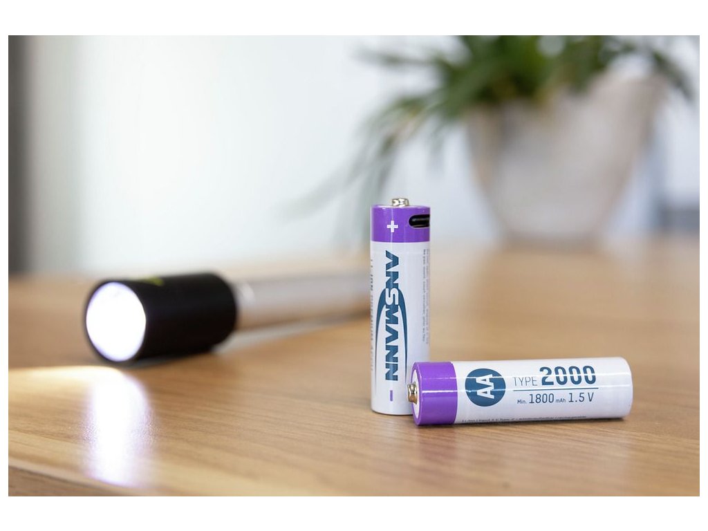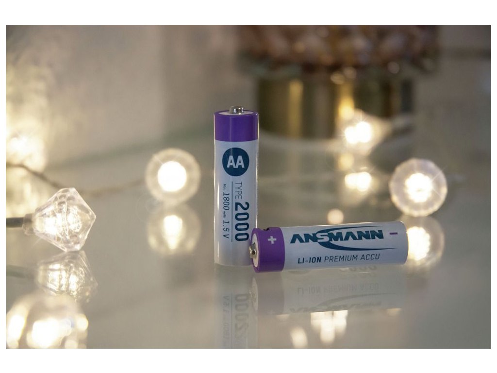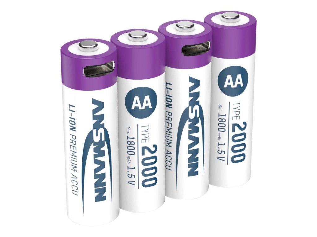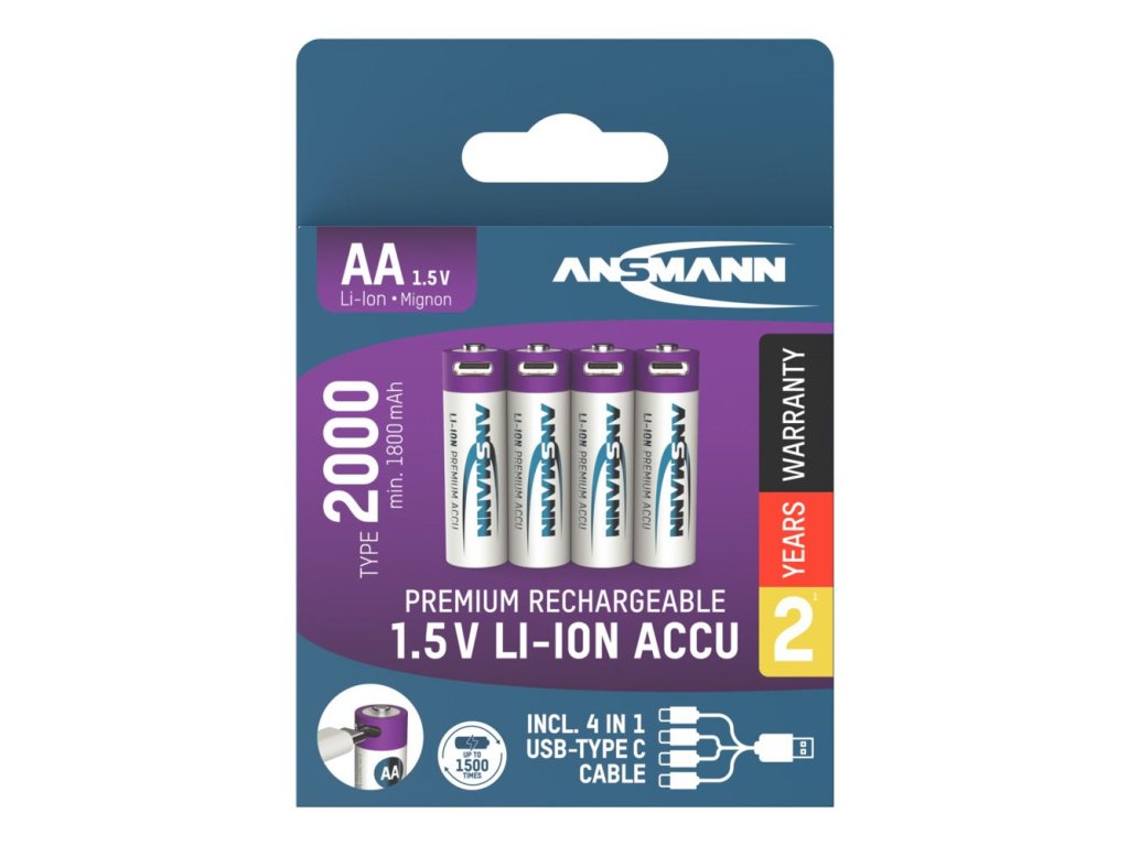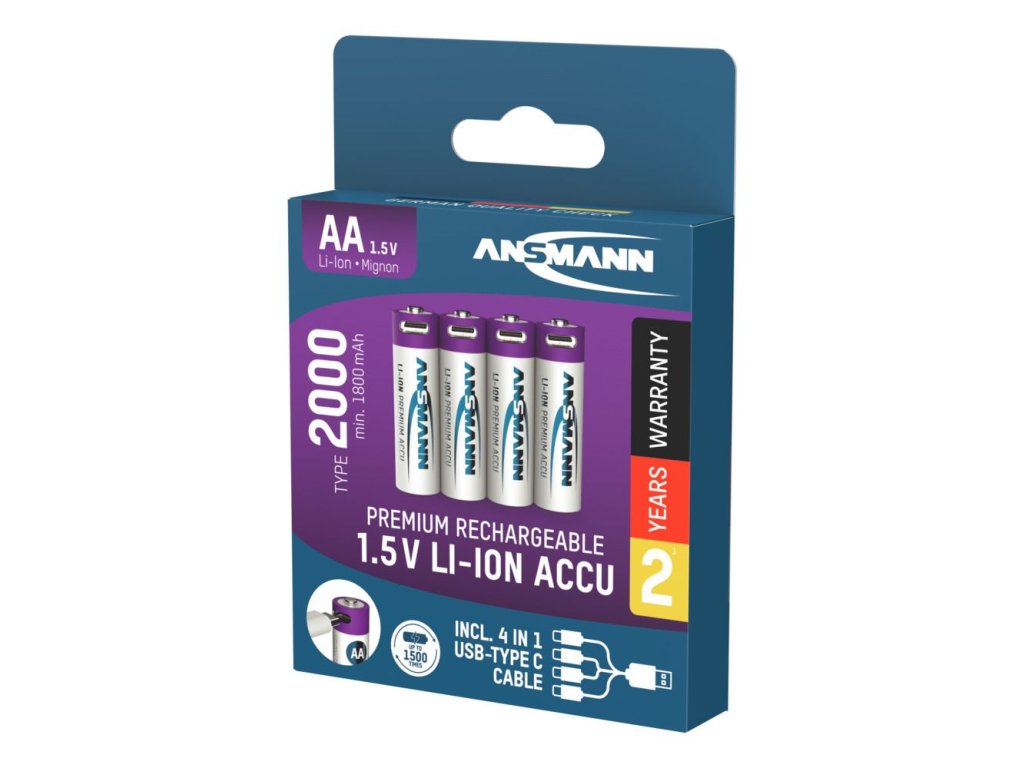 Ansmann Li-Ion Akkus Mignon AA Typ 2000 (min. 1800 mAh) 4er Papierblister. Mignon AA Lithium-Ionen Akku - 1,5 V / Typ 2000 (min. 1800 mAh) / 3,26 Wh - Type C Ladung - geschützter Akku aufgrund Sicherheitsbeschaltung