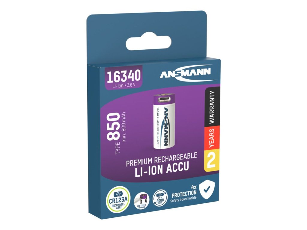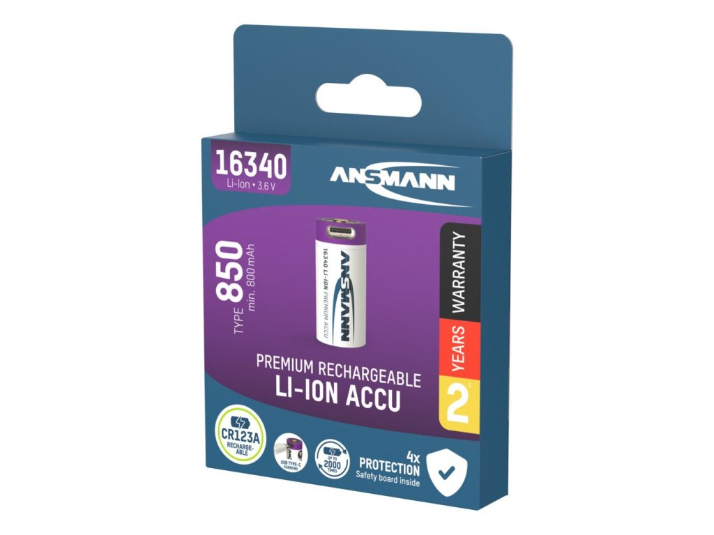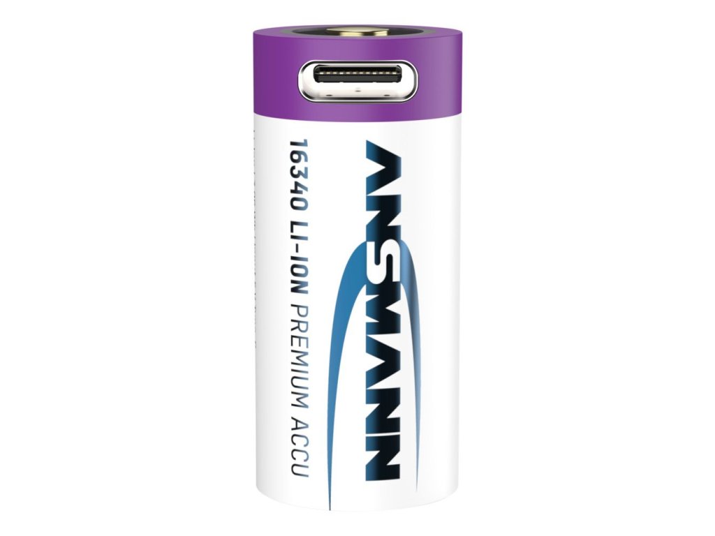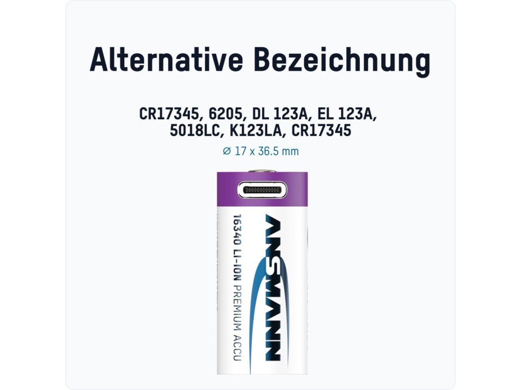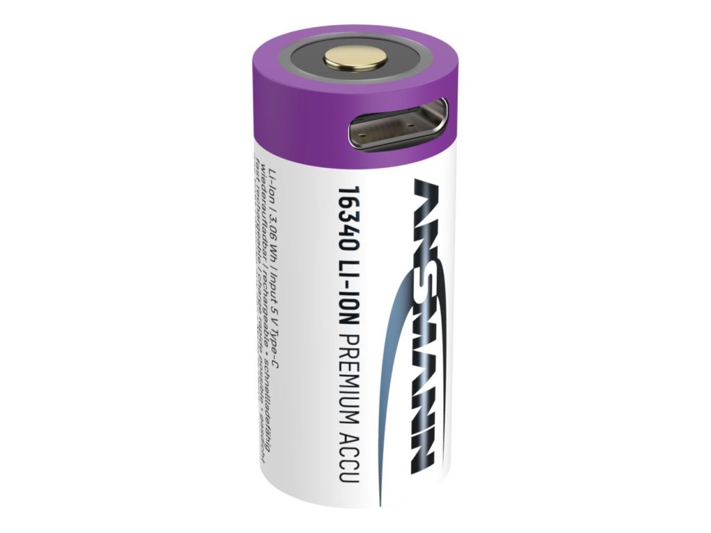 - Hochwertige ANSMANN Lithium Batterie 16340 / RCR123 mit Safety Board und integrierter USB Typ-C Ladebuchse. Der Ladestrom wird, wenn über die USB Typ-C Buchse geladen wird, auf max. 0,5A begrenzt.