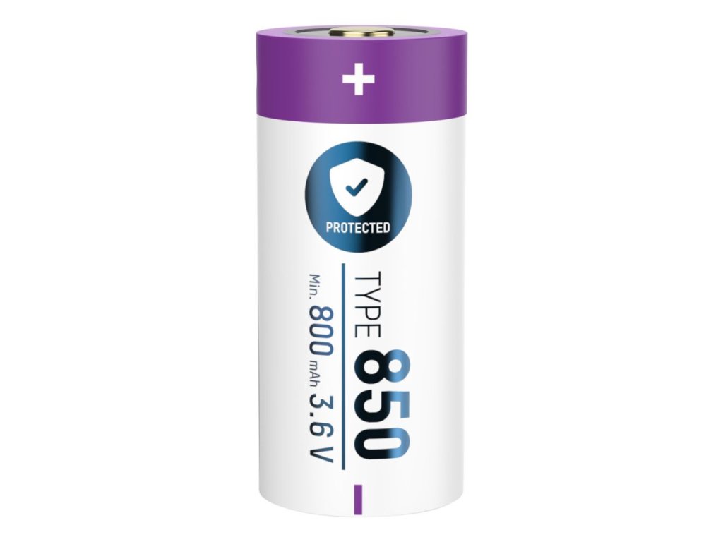 Li-Ion Akku 16340 / RCR123 Typ 850 (min. 800 mAh) mit USB Typ-C Ladebuchse. 16340 / RCR123 Lithium-Ionen Akku – 3,6 V / Typ 850 (min. 800 mAh) / 3,06 Wh – geschützter Akku aufgrund Sicherheitsbeschaltung - wiederaufladbare Alternative zu CR123A.