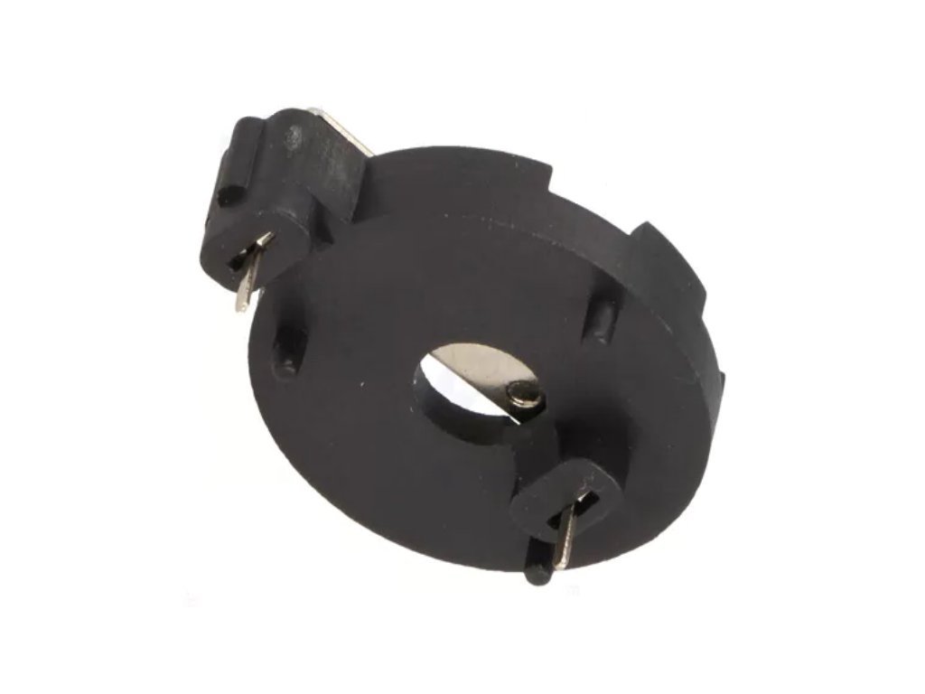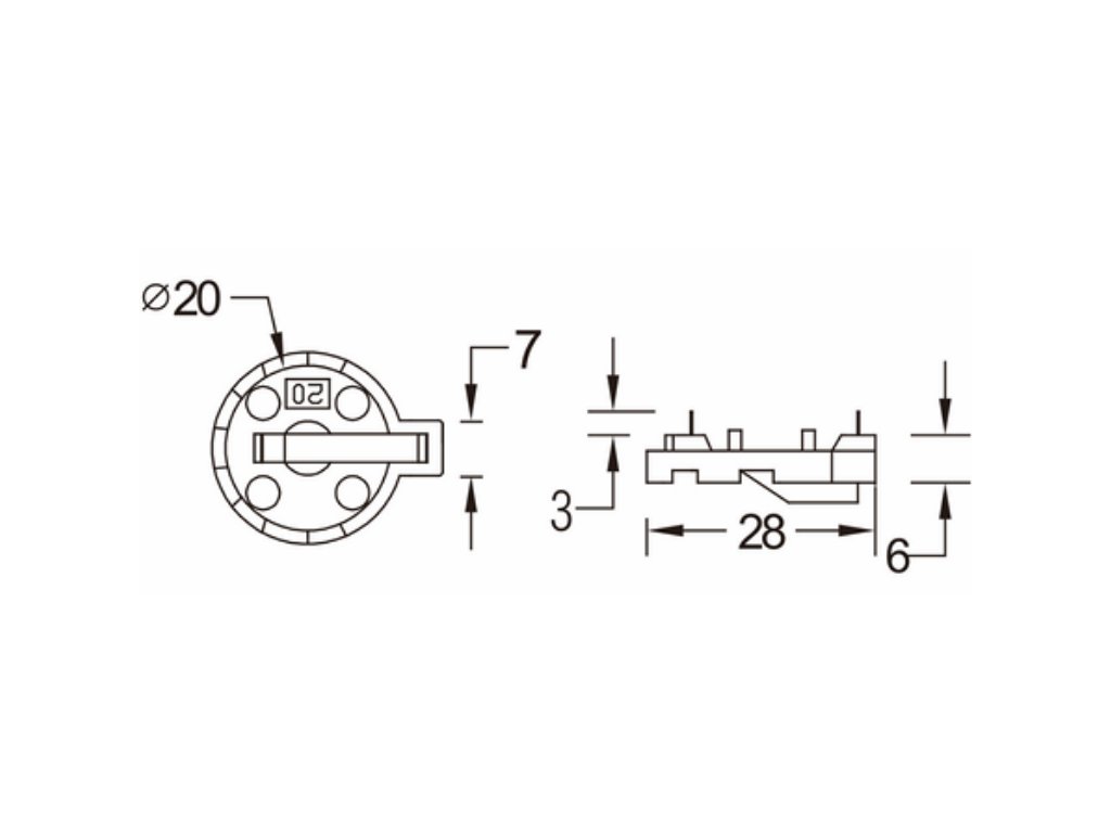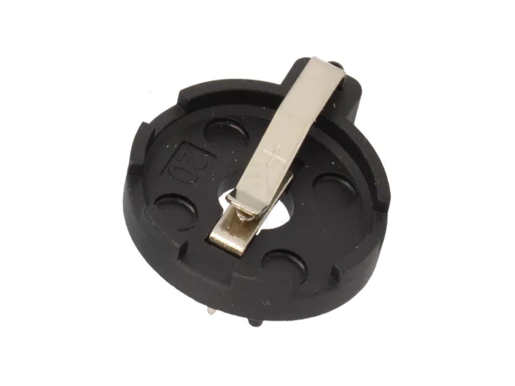 Batteriehalter für Knopfzellen bis max. 20 mm , mit Printanschluß. Horizontale Halterung für Knopfzellen (liegend). Knopfzellenhalter für Einzelzellen. Die Bauform ermöglicht einen einfachen Batteriewechsel. Der Knopfzellenhalter ist geeignet für Back-up Systeme oder Computer Memory Anwendungen.