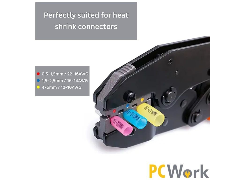 PCW04B Crimpzange mit Ratschenfunktion - Perfekte Crimps für Wärme-Schrumpfverbinder - die PCW04B Crimpzange ist speziell entwickelt worden, um Ihnen bei der Herstellung von perfekten Crimps für Wärme-Schrumpfverbinder zu unterstützen. Mit ihrem robusten und langlebigen Produktdesign ist diese Zange ein zuverlässiges Werkzeug für den professionellen Einsatz. Die Crimpbacken der Zange sind herausnehmbar, sodass Sie ebenfalls andere Crimpbacken für andere Crimp-Verbinder Sorten einsetzen können.