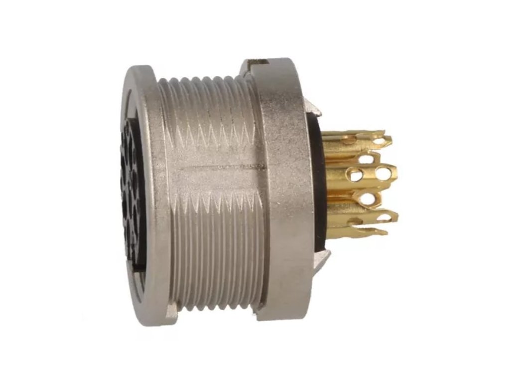 Lumberg KFV 81 - 270° Rundsteckverbinder Kontakte mittig, Einbaukupplung nach IEC 61076-2-106, IP 40, mit Schraubverschluss und Lötanschlüssen, für Frontmontage. DIN-Einbaukupplung für Frontmontage, 8-polig mit Schraubverschluss nach DIN 45 321.