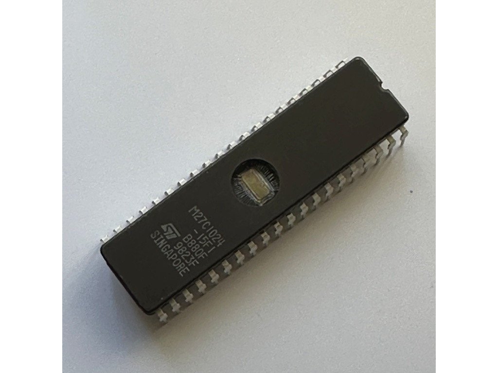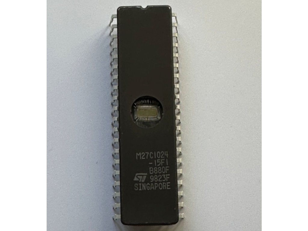 STMicroelectronics M27C1024-15F1 (27C1024-150) UV-Eprom-Speicher 150ns 1MBit 64kx16 DIP 40-pin 1.048.576-Bit (64kx16). Der M27C1024-15F1 eignet sich ideal für Mikroprozessorsysteme, die große Datenmengen oder Programmspeicher benötigen, und ist in 65.536 Wörter à 16 Bit organisiert. Das FDIP40W-Gehäuse (Fensterkeramik-Fritte-Versiegelung) verfügt über einen transparenten Deckel, der es dem Benutzer ermöglicht, den Chip ultraviolettem Licht auszusetzen, um das Bitmuster zu löschen. Anschließend kann gemäß dem Programmierverfahren ein neues Muster auf den Baustein geschrieben werden.