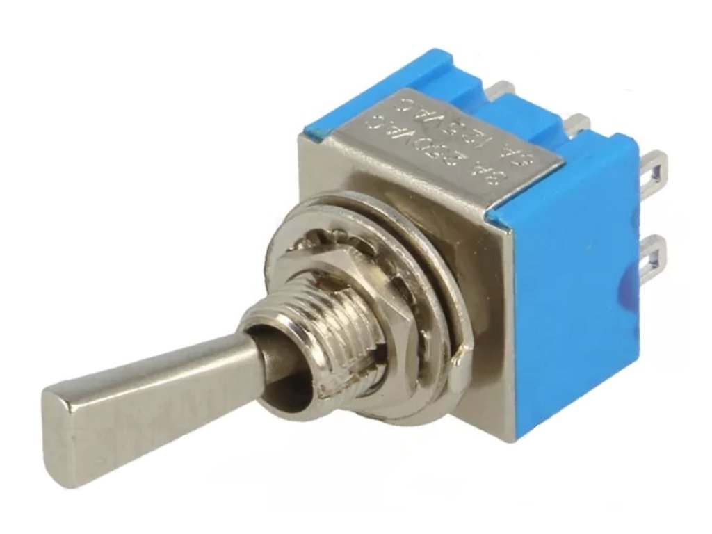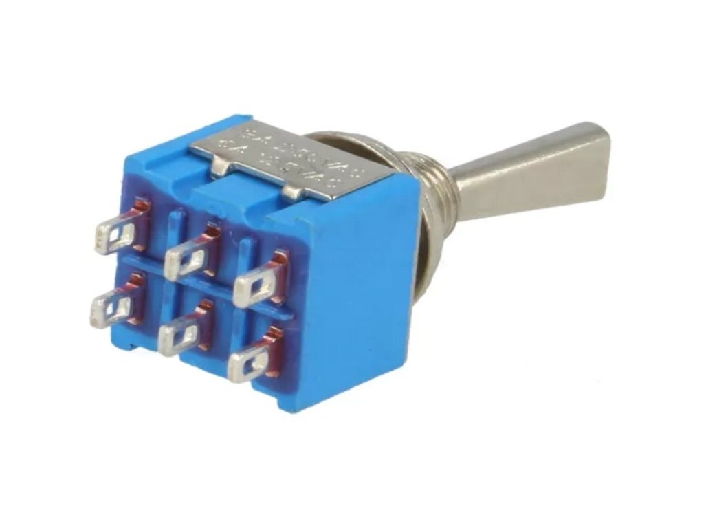 Miniatur-Kippschalter, Flacher Hebel, Schalter, Hebelschalter, 2-stellig, DPDT, Ein-Ein (ON-ON), 250V~/3A, 125V~/6A, mit Zentralbefestigung.