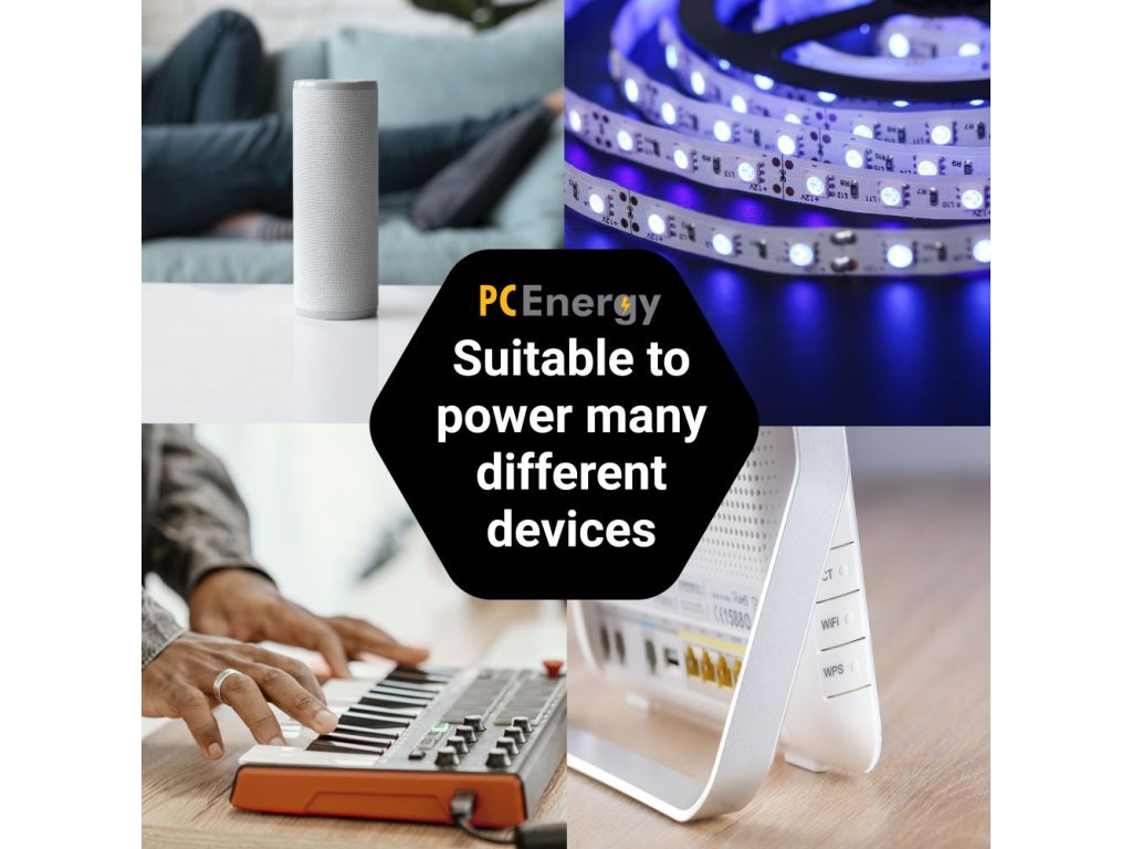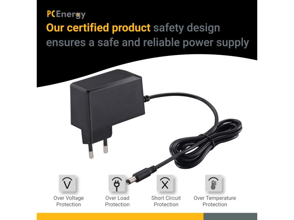 PCE12-5-2,4-WM Universal Netzteil - das PCE12-5-2,4-WM ist ein kleines, kompaktes Steckernetzteil, welches universell einsetzbar ist. Es versorgt angeschlossene Geräte mit 5V Gleichspannung und bis zu 2,4A Strom (12 Watt). Mit dem standardisiertem P1J Hohlstecker-Anschluss (5,5 x 2,1 x 10mm) ist es kompatibel zum Laden von vielen unterschiedlichen elektrischen Kleingeräten wie Router, Scanner, DVD-Player, Dockingstationen, Media Player, Motorsteuerung, Bürotechnik u. v. m. Dank des integrierten Überlastungs-, Überspannungs-, Übertemperatur- sowie Kurzschluss-Schutz ist besonders für Sicherheit gesorgt.