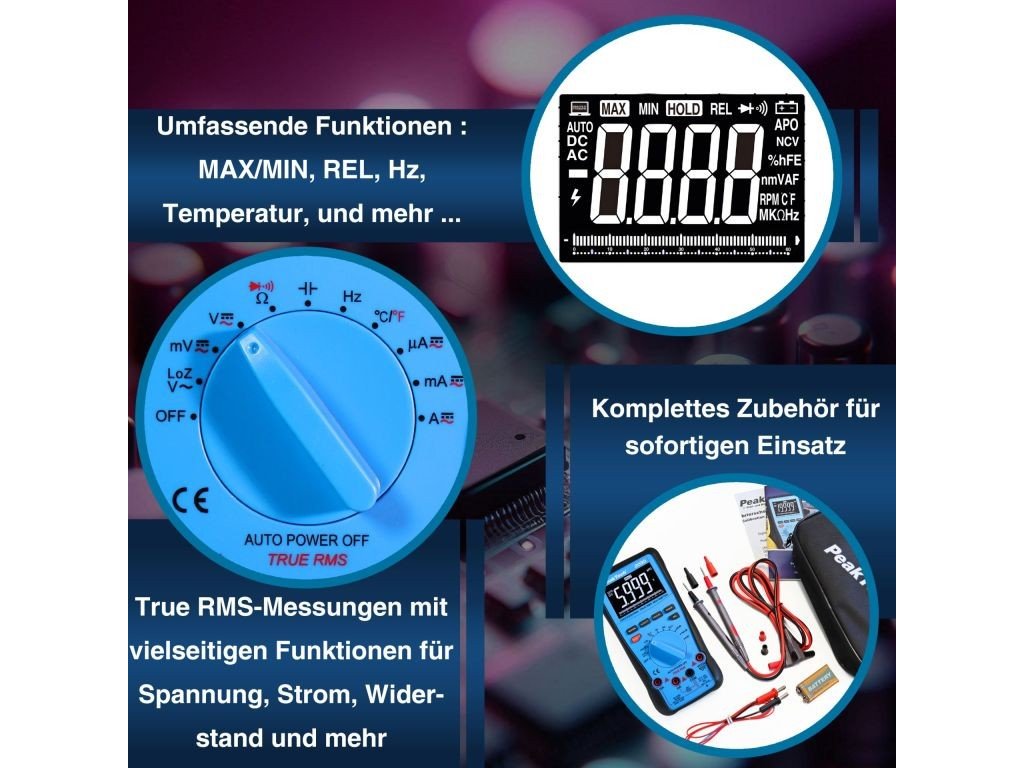 PeakTech® P 2030 True RMS 1000 V Digitalmultimeter 6000 Counts, das PeakTech 2030 wurde für den Professionellen Einsatz entwickelt und bietet eine Vielzahl an Messfunktionen von elektrischen Messgrößen für jeden Anwender aus Industrie, Handwerk, Ausbildung und dem Labor. Es wurde nach neuesten Entwicklungsaspekten gefertigt und verfügt über ein doppelt isoliertes Spritzgussgehäuse mit anthrazitfarbener Gummierung, eine Service-Klappe auf der Rückseite, über welche nicht nur die Batterie ersetzt werden, sondern auch die Schmelzsicherungen getauscht werden können. Das Gerät verfügt über eine invertierte LCD Anzeige mit Bargraph und 61 Segmenten. Die automatische Bereichswahl bietet eine sehr anwenderfreundliche Bedienung und Messwerte können hervorragend auf dem dauerhaft beleuchteten Display abgelesen werden. Es unterstützt Messungen für DCV, ACV, DCA, ACA, LowZ ACV, Ohm, Cap, Hz, °C, °F, Dioden- oder Durchgangsprüfung. Durch die hohe Überspannungskategorie CAT III bis 1000V, können Sie dieses Gerät sicher an elektrischen Installationen und Anlagen verwenden.