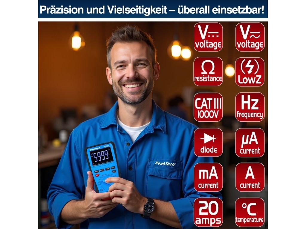 Marke PeakTech steht für Innovation und hohe Qualität mit einem hervorragenden Preis-/Leistungsverhältnis. PeakTech entwickelt für seine Kunden innovative und spannende Produkte in modernem Design. Dabei müssen PeakTech Produkte auch für den Hobby-Anwender, Handwerker, Bastler oder für den Einsatz im Lehr- und Schulunterricht finanzierbar sein. Durch die breite Produktauswahl von ca. 400 Modellen, versteht PeakTech sich als Komplettausstatter für elektronische Messtechnik in Labor, Universität und Schule sowie Industrie und Handwerk. Als deutsches Unternehmen erfüllt PeakTech alle Normen, Gesetze und EU-Richtlinien, was Ihnen als Kunden besondere Sicherheit bei Anwendung und Abwicklung garantiert.