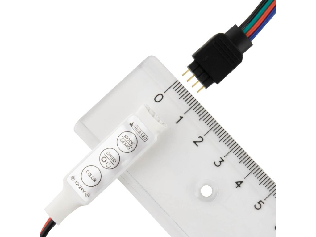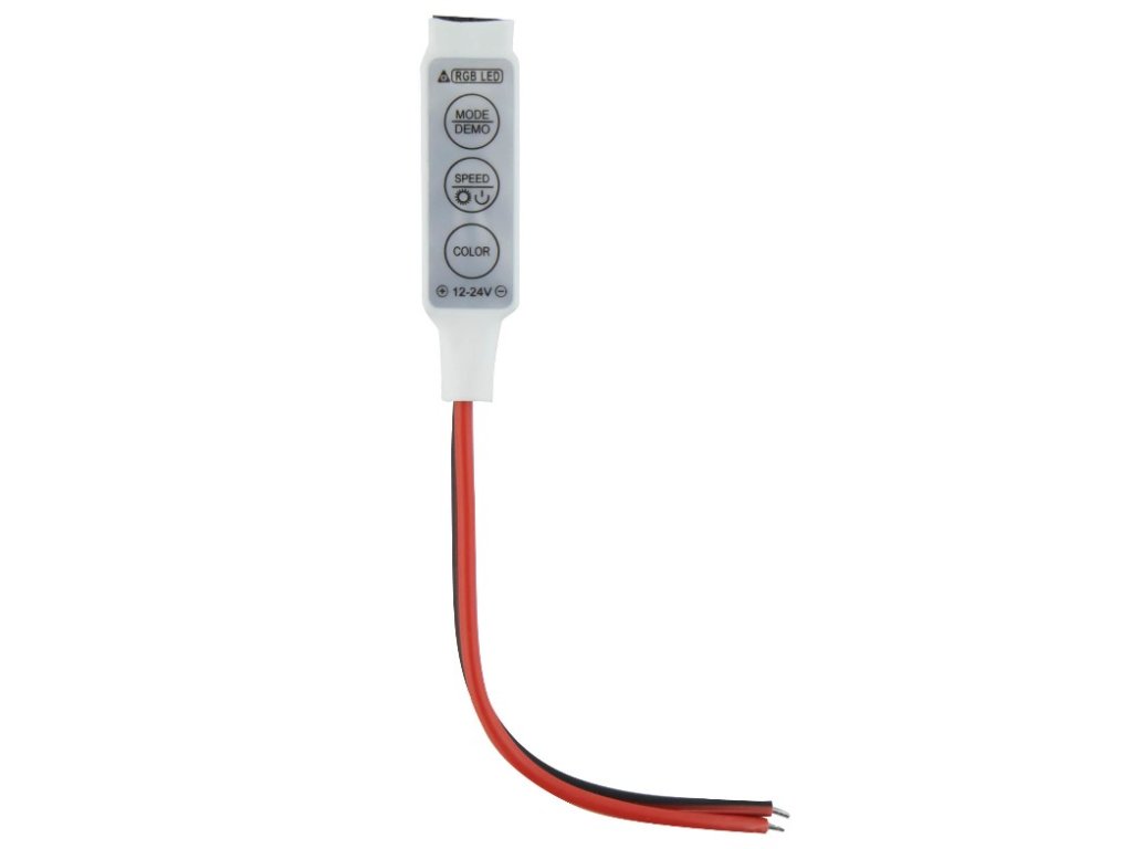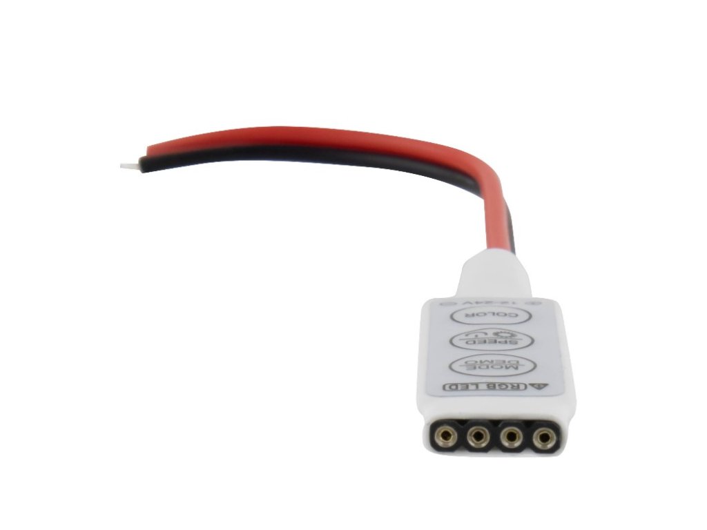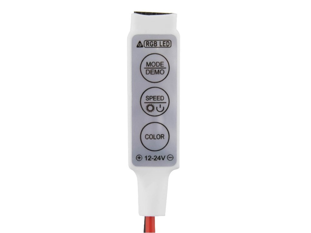 RGB Inline Controller für 12-24V LED RGB-Streifen mit 3 Tasten. Einfacher Farbwechselcontroller für RGB-Strips. Sie können zwischen 19 verschiedenen Programmen und 20 festen Farben auswählen - Die Farbwechsel-Programme können in der Geschwindigkeit variiert werden (10 Einstellungen) - Fest gewählte Farben können in 5 Stufen gedimmt werden. Alle Einstellungen bleiben gespeichert (auch bei Unterbrechnung der Stromversorgung).